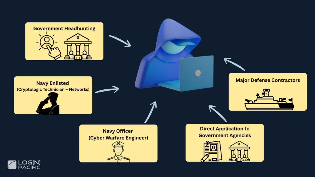The Navy has a position called “Cyber Warfare Engineer.” This route has a very high barrier to entry.